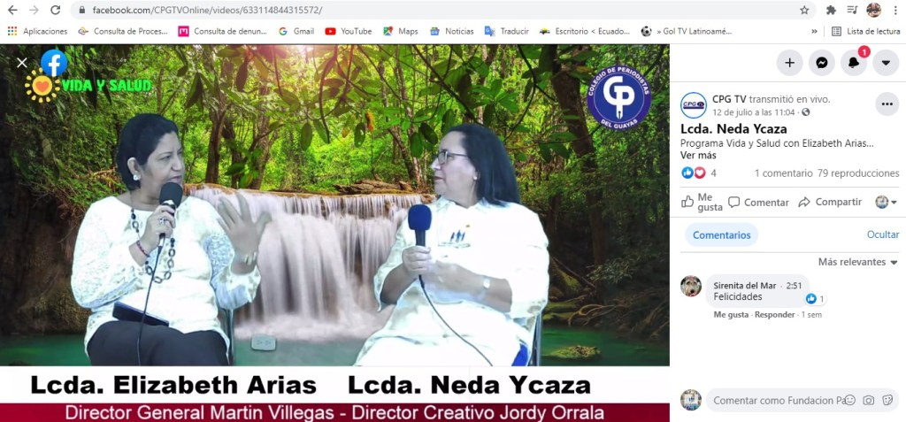 Entrevista con nuestra directora, Lcda. Neda Ycaza de Guzmán, en el programa Vida y Salud del canal digital del Colegio de Periodistas del Guayas CPG TV , el 12 de julio del 2021. Gracias por la oportunidad de difundir nuestras actividades.