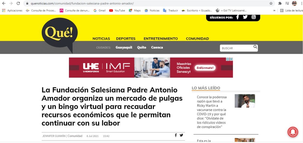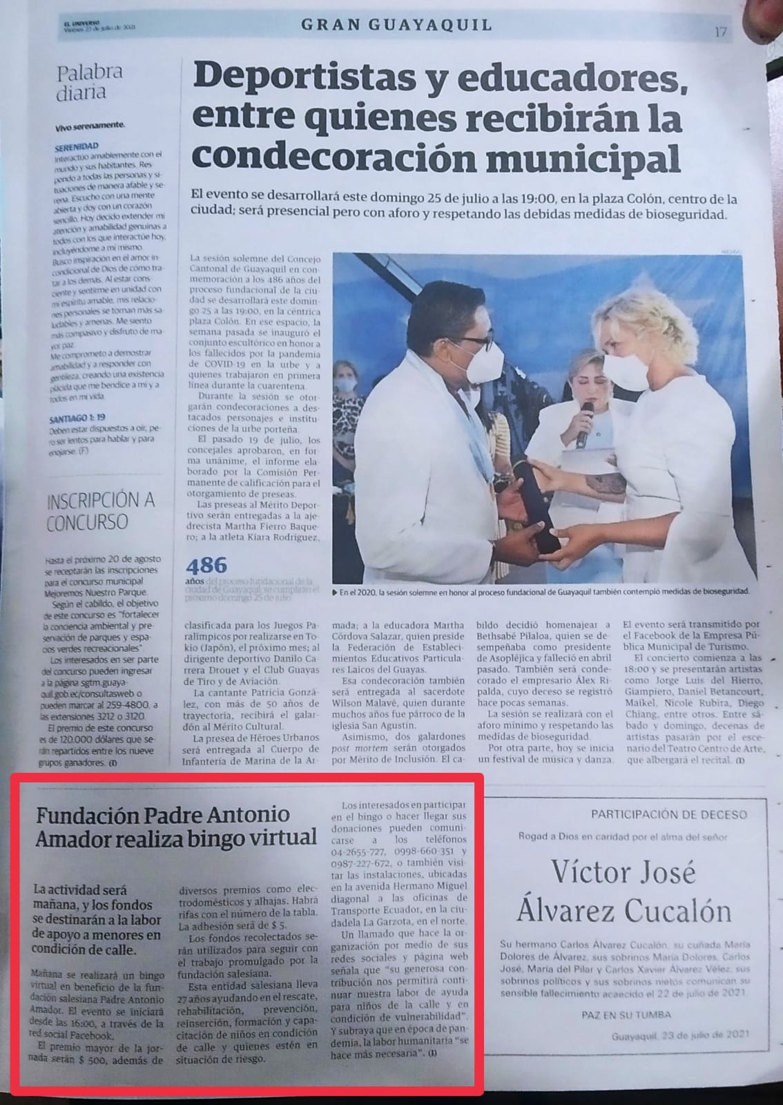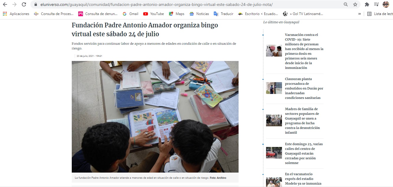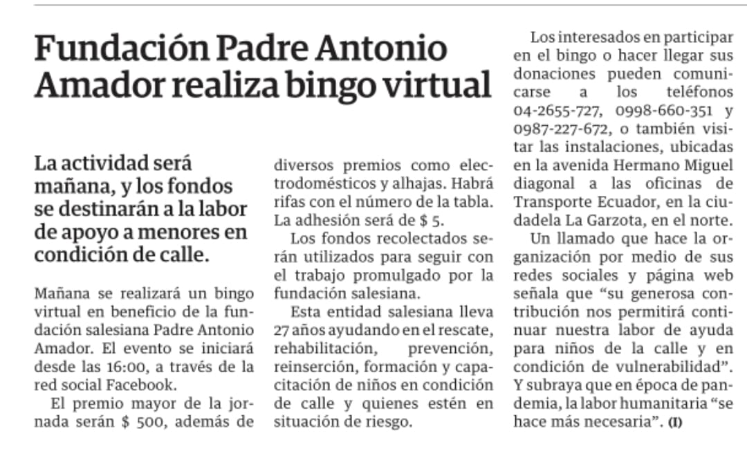 Le damos las gracias a Diario El Universo por las dos notas publicadas sobre nuestras actividades y bingo virtual, en sus ediciones del 20 y del 23 de julio del 2021.